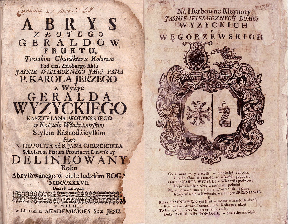 Abrys złotego Geroldów fruktu, trojakim charakteru kolorem pod cień żałobnego aktu JW. JMsci Pana P. Karola Jerzego z Wyżyc Geralda Wyźyckiego kasztelana wołyńskiego w kościele Włodzimirskim stylem kaznodzieyskim przez X. Hippolita od S. Jana Chrzciciela Scholarum Piarum Prowincyi Litewskiey delineowany roku abrysowanego w ciele ludzkim Boga.