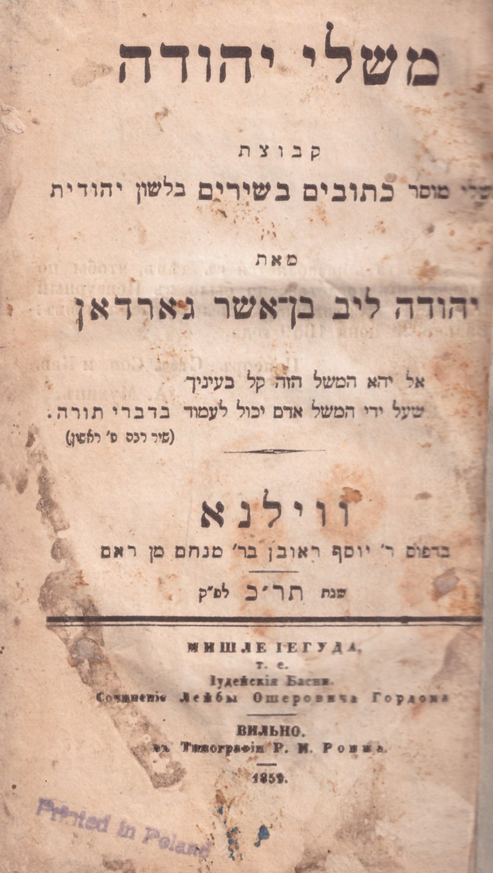 Иегуда Лейб Гордон (Лев Осипович Гордон, 1830-1892) Mishle Yehudah. Ḳevutsat mishle musar ketuvim be-shirim be-lashon Yehudit.