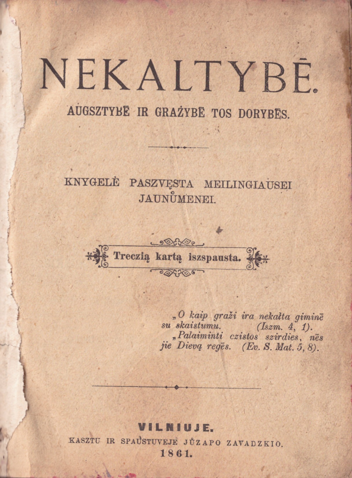 Nekaltybē : augsztibē ir grażybē tos dorybēs; knygele paszvęsta meilingiausei jaunůmenei / Treczią kartą iszspausta