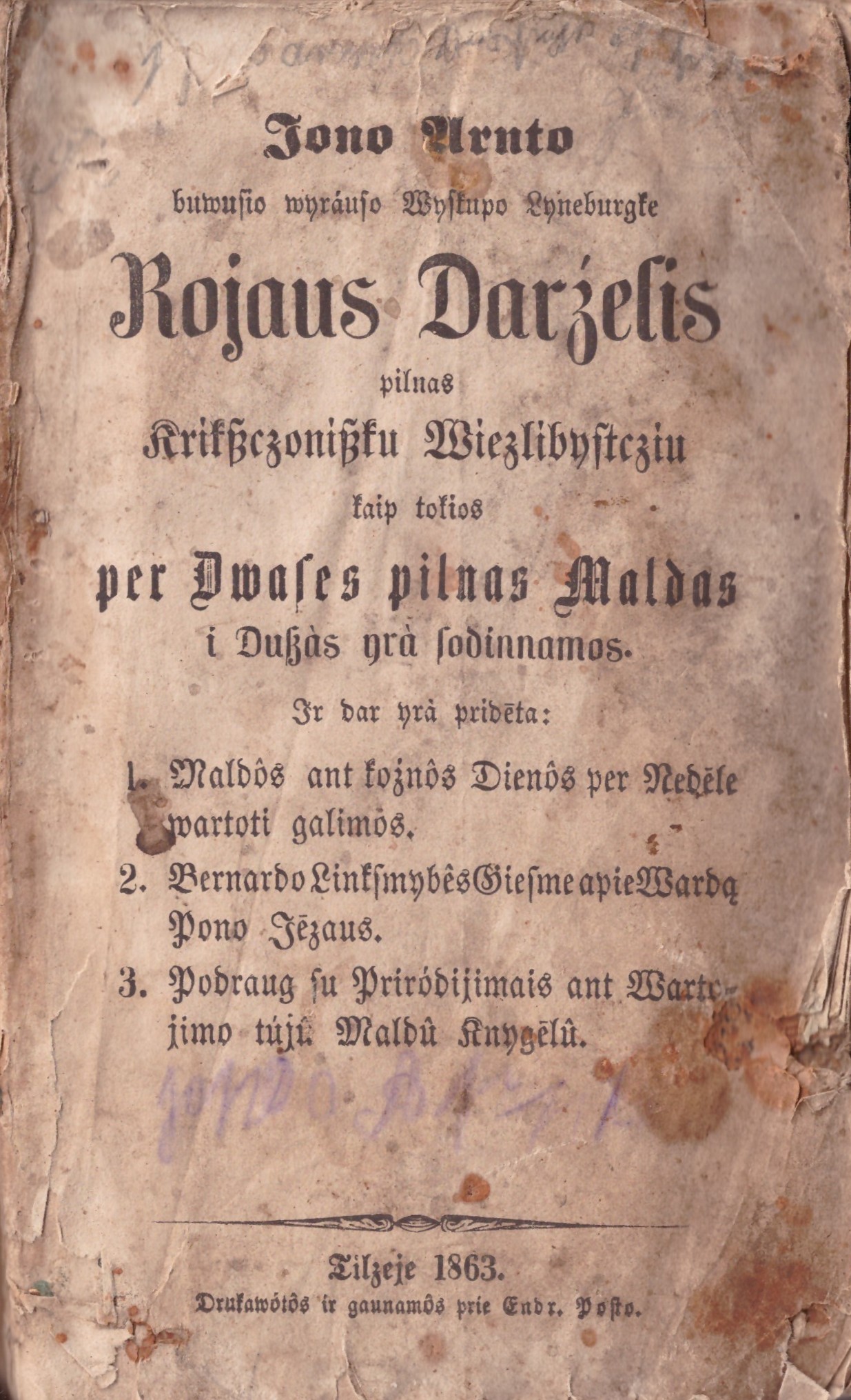 Jono Arnto buwusio wyrauso wyskupo Lyneburke Rojaus darźelis pilnas krikczoniszkû wieźlibystczû, kaip tokios per dwasês pilnąs maldąs į dusziąs yra sodinnamos : ir dar yra pridēta: 1. Keturoliką dywnû nussidawimû kurrie tikkosi su tom’s knigelems ir to wyro rasztais. 2. Bernardo linksmybês giesme apie wardą Pono Jezaus. 3. Podraug su prirodijimais ant wartojimo tujû maldû knygelû /