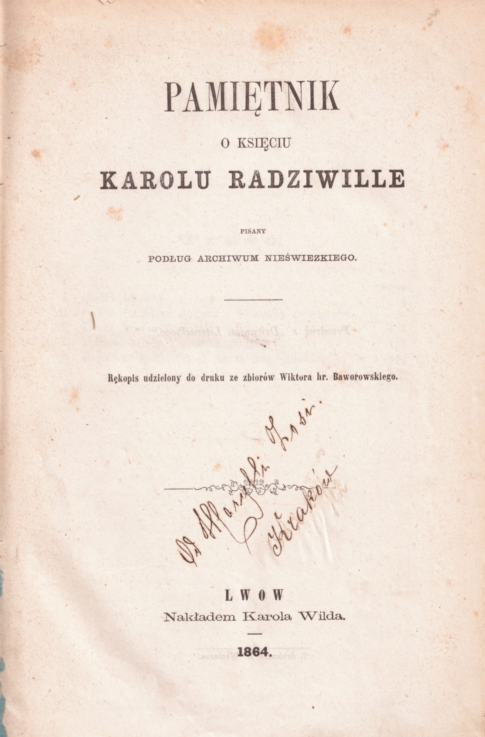 Pamiętnik o księciu Karolu Radziwille : pisany podług archiwum nieświezkiego; rękopis udzielony do druku ze zbiorów Wiktora hr. Baworowskiego