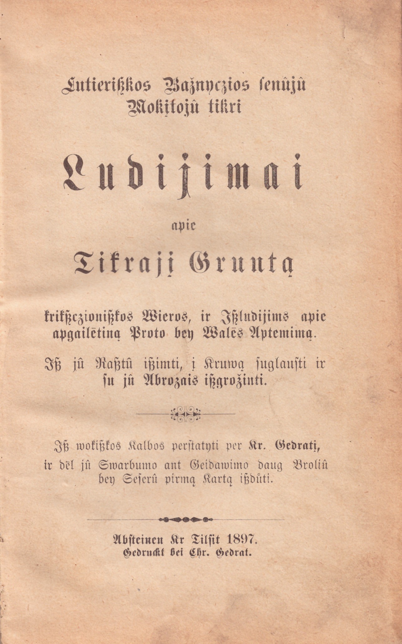 Lutieriszkos bažnyczios senûjû mokitojû tikri ludijimai apie tikrajį gruntą krikszczioniszkos wieros, ir iszludijims apie apgailētiną proto bey walēs aptemimą / isz jû rasztû iszimti, į kruwą suglausti ir su jû abrozais iszgrožinti ; isz wokiszkos kalbos perstatyti per Kr. Gedratį, ir dēl jû swarbumo ant geidawimo daug broliû bey seserû pirmą kartą iszdůti