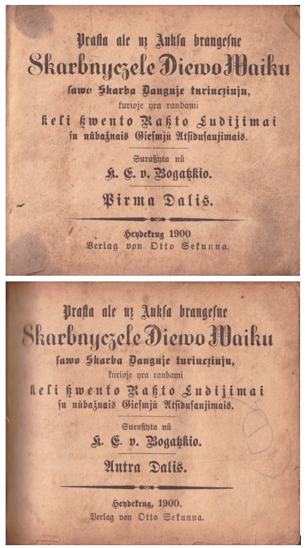 Heydekrug [Šilutė], Verlag von Otto Sekunna, 1900. In Memel [Klaipėdoje], Gedruckt bei Holz u. Szernus Nachfolger, 1900. Pirma dalis, [2], 366. Antra dalis, [2], 366. Dvi dalys vienoje knygoje