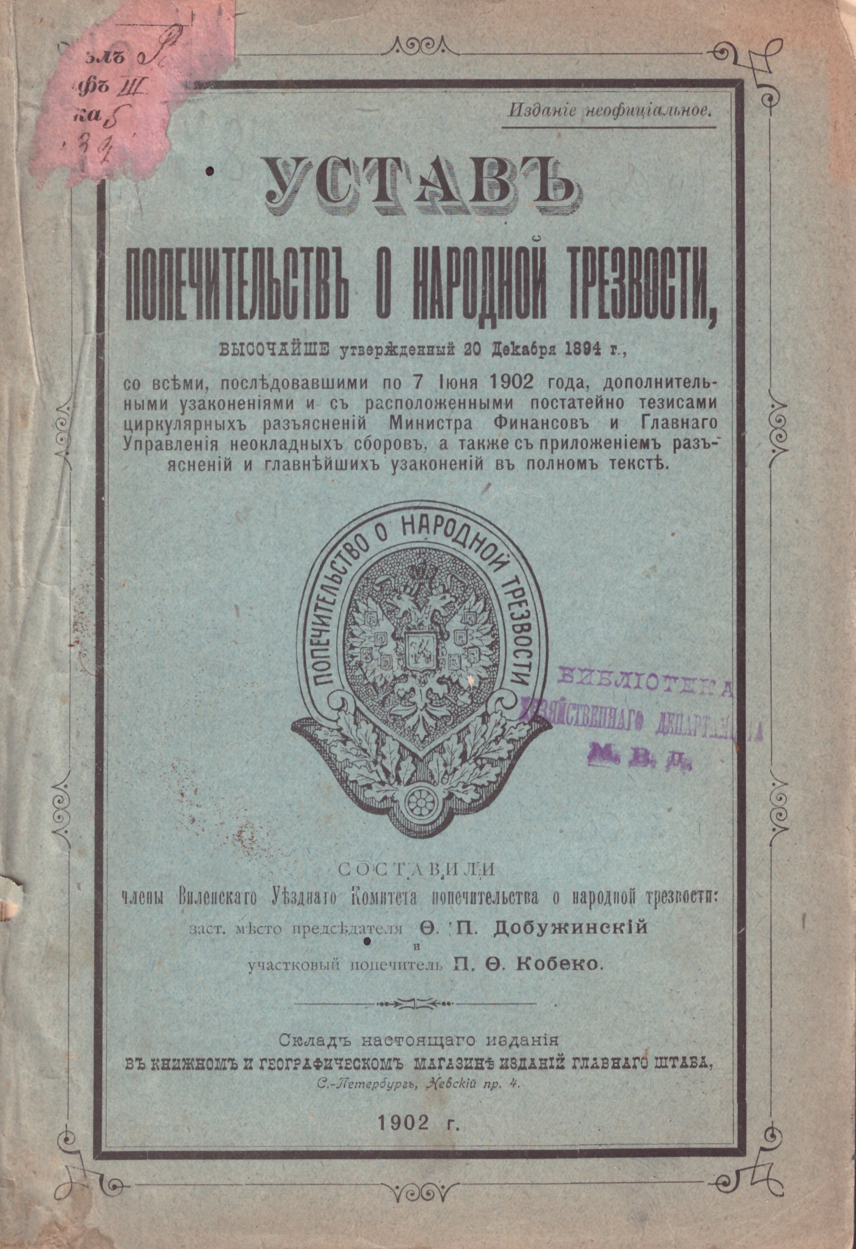 Устав попечительства о народной трезвости, высочайше утвержденный 20 декабря 1894 г. : Со всеми последовавшими по 7 июня 1902 г. доп. узаконениями и с располож. постатейно тез. циркуляр. разъясн. министра фин. и Гл. упр. неоклад. сборов, а также с прил. разъясн. и главнейших узаконений в полном тексте
