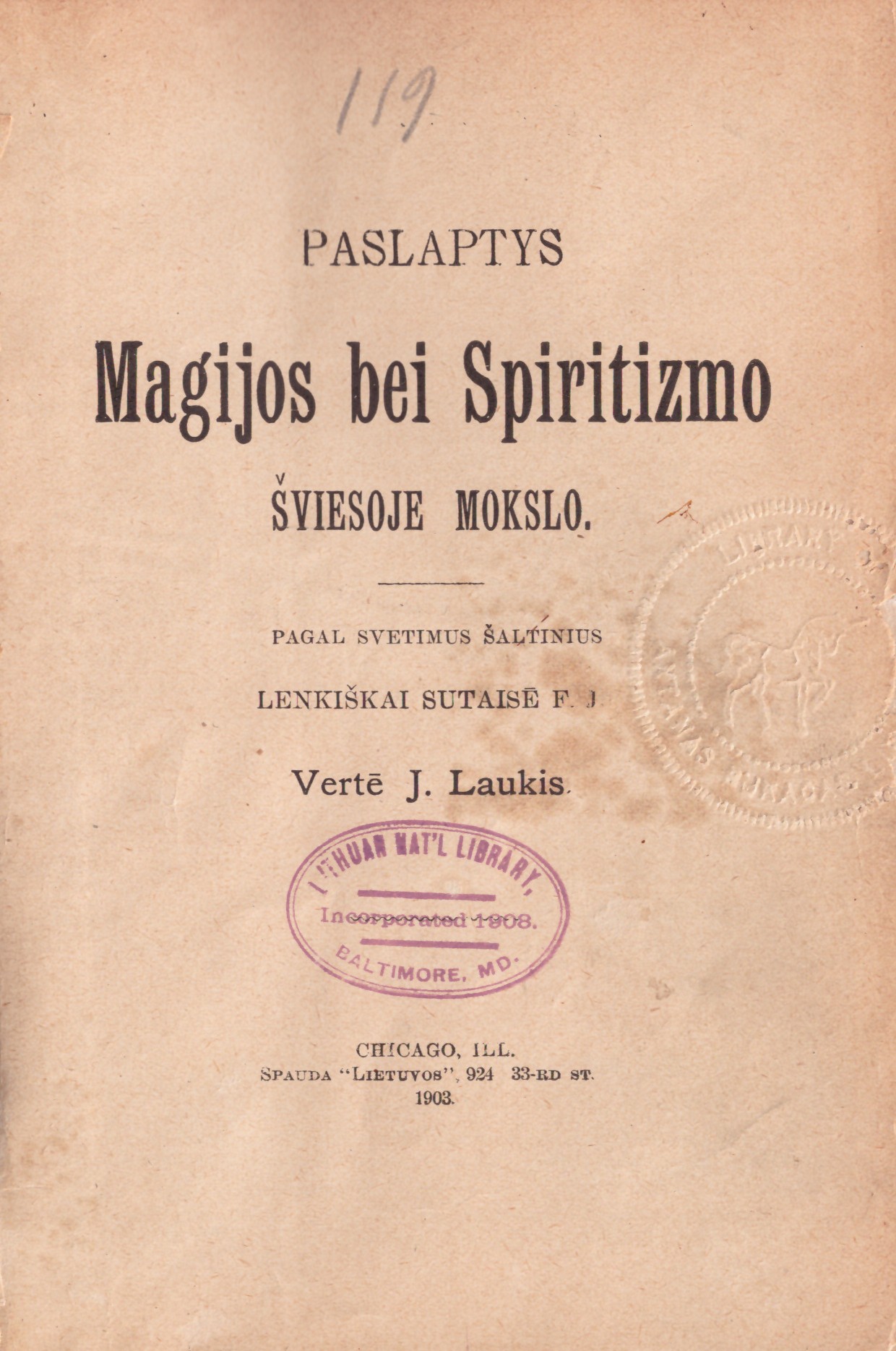 Paslaptys magijos ir spiritizmo šviesoje mokslo / pagal svetimus šaltinius lenkiškai sutaisē F.J. ; vertē J. Laukis