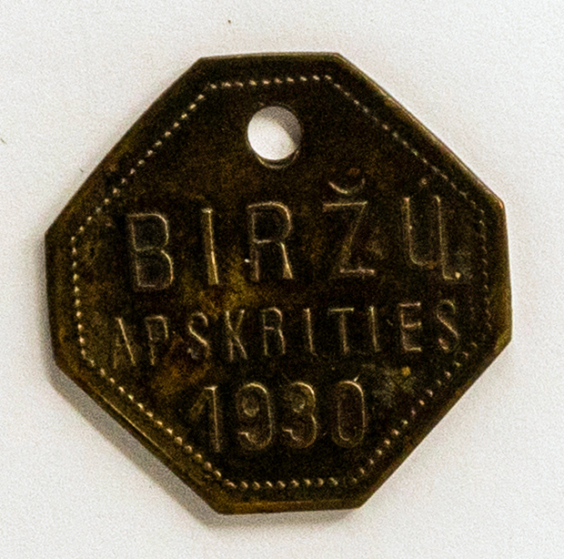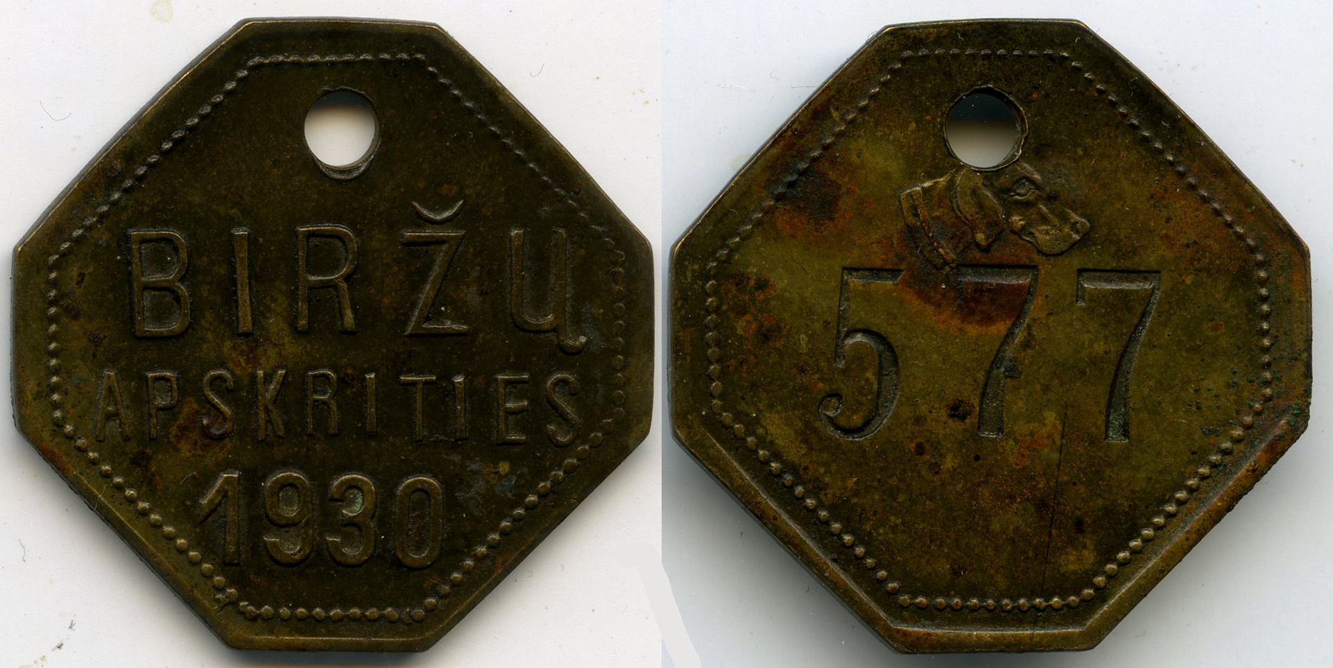 Biržų apskrities 1930 m. šunų registracijos žetonas Nr. 577. Lietuva. Apie 1929 m.